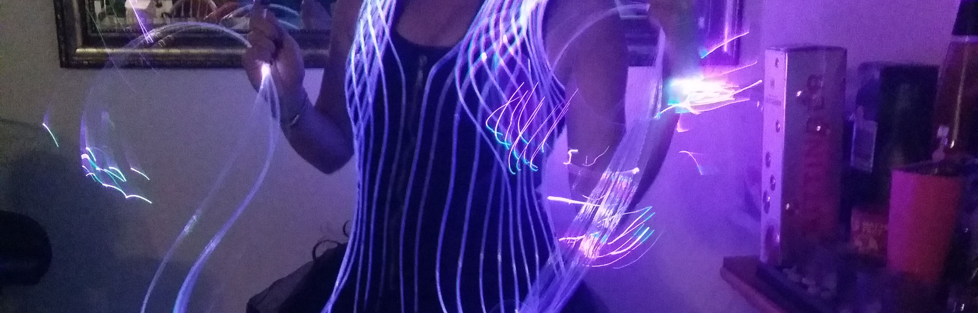 My passion for sewing started when I was still in elementary school. I found my peace in the stillness of making pretty satin, lace pillows and cross-stitched pieces; being raised by alcoholics, I was constantly under verbal attack; life was very hard, even brutal. Starting at the age of 11, I was sexually abused by the man of the house. My sewing time was my refuge, it was the place and time my creative essence was able to come out and play. Lonely and ashamed of my life, I was closed off and didn’t have many friends. My me time was mostly cross-stitch and cross country running. I still cross-stitch. During these dark times I put all the love I had into the pieces I created which is exactly what I do with each wearable fiber optic piece I create today.